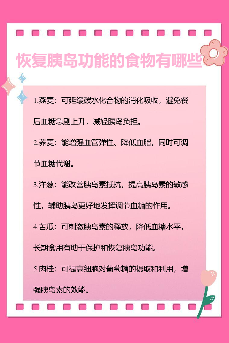 燕麦、荞麦、洋葱、苦瓜、肉桂等食物对恢复胰岛功能有一定帮助。