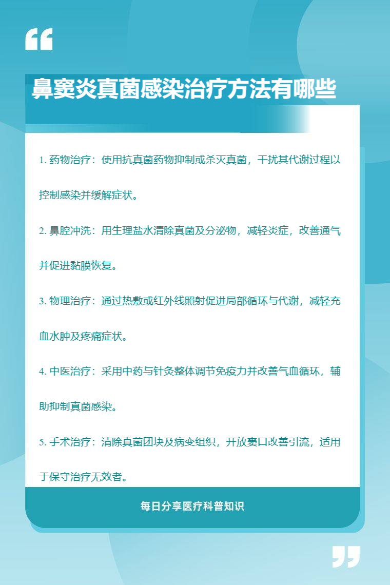 鼻窦炎真菌感染的治疗方法有药物治疗、鼻腔冲洗、物理治疗、中医治疗、手术治疗等。