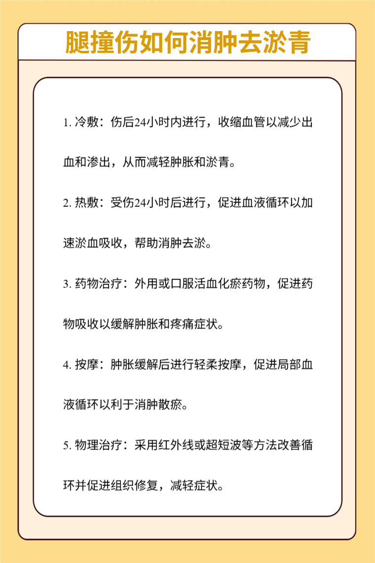 腿撞伤后可通过冷敷、热敷、药物治疗、按摩、物理治疗等消肿去淤青。