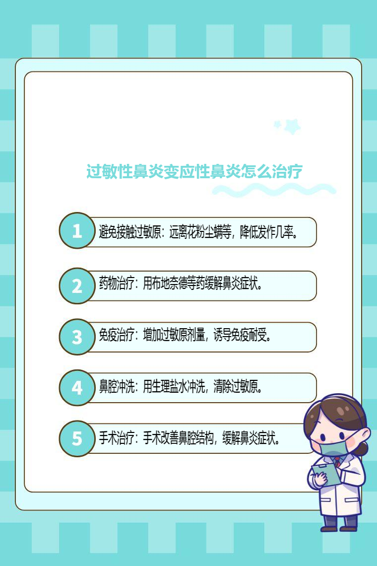 过敏性鼻炎变应性鼻炎的治疗方法主要有避免接触过敏原、药物治疗、免疫治疗、鼻腔冲洗、手术治疗等。