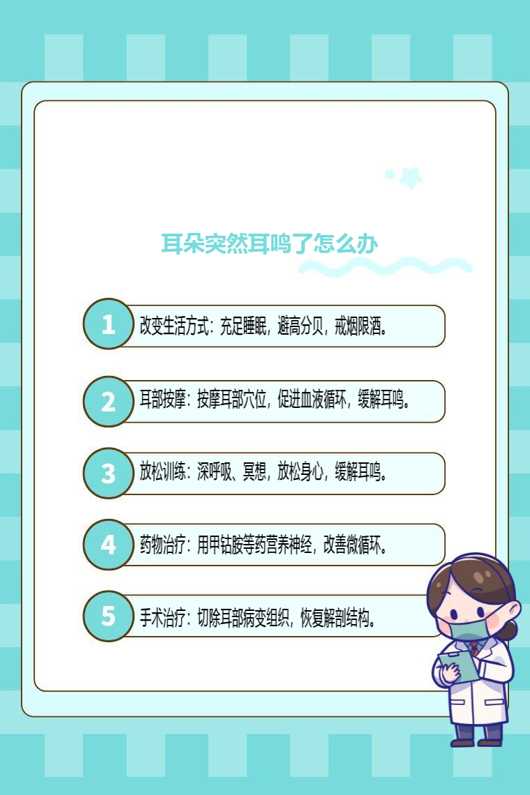 耳朵突然耳鸣可通过改变生活方式、耳部按摩、放松训练、药物治疗、手术治疗等方法来应对。
