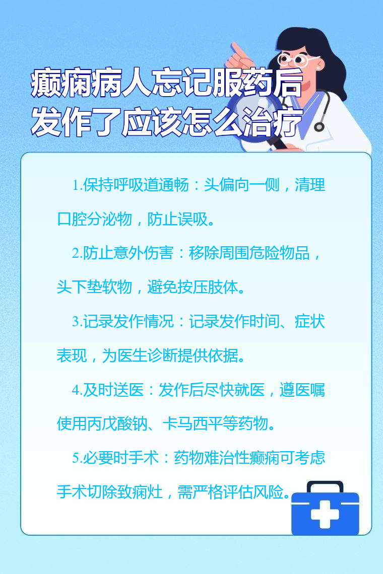 癫痫病人忘记服药后发作可通过保持呼吸道通畅、防止意外伤害、记录发作情况、及时送医、必要时手术等方法治疗。