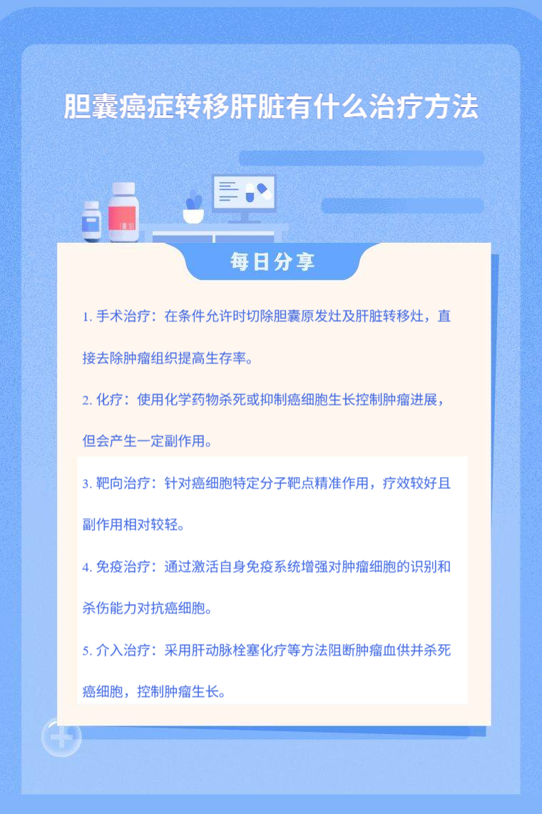 1. 手术治疗:若转移灶局限且患者身体状况允许,可考虑手术切除胆囊原发病灶及肝脏转移灶,以直接去除肿瘤组织,缓解症状、提高生存率,但对患者身体条件和肿瘤情况要求较高。