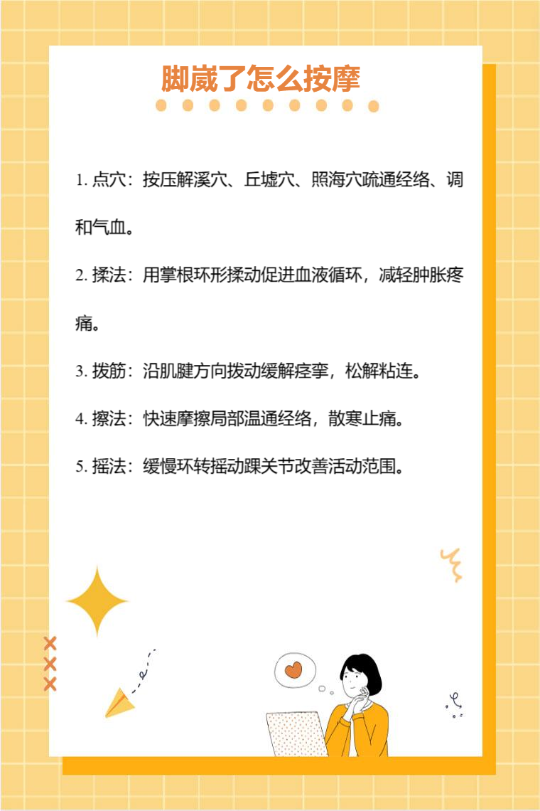 脚崴了可通过点穴、揉法、拨筋、擦法、摇法等按摩方式来缓解不适。