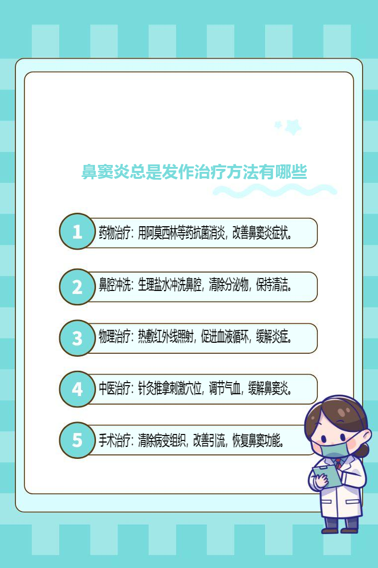 鼻窦炎总是发作的治疗方法有药物治疗、鼻腔冲洗、物理治疗、中医治疗、手术治疗等。