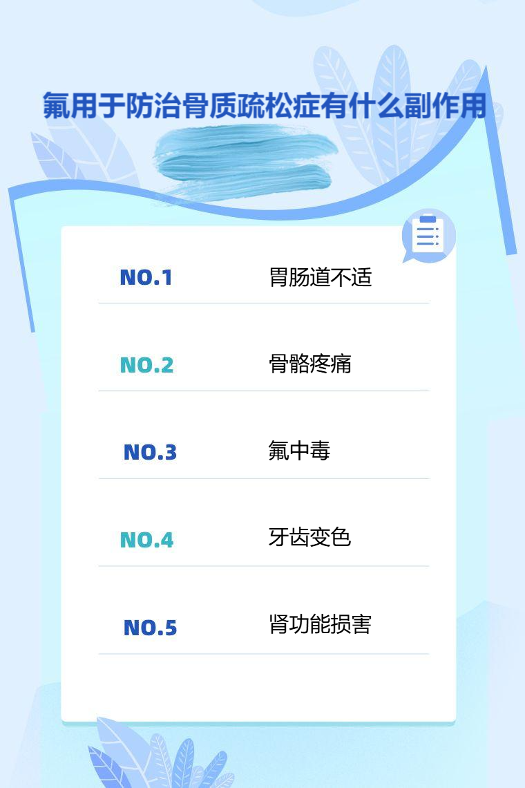 1. 胃肠道不适:使用氟化物防治骨质疏松症时,常见的副作用是对胃肠道产生刺激,引发恶心、呕吐、腹痛以及腹泻等症状。因为氟化物进入胃肠道后,会干扰胃肠道正常的消化和吸收功能,影响胃肠道黏膜的正常状态,进而导致这些不适症状的出现。