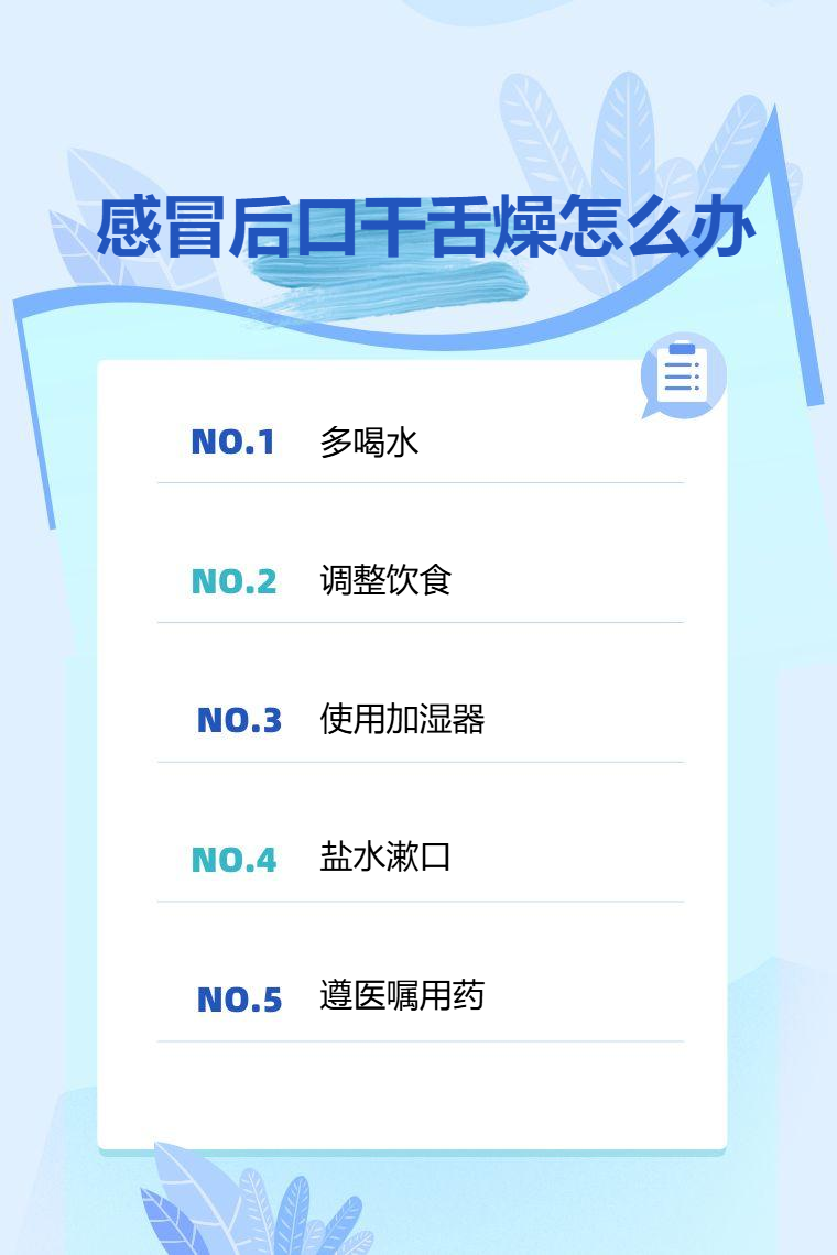 感冒后口干舌燥可通过多喝水、调整饮食、使用加湿器、盐水漱口、遵医嘱用药等方法来缓解。