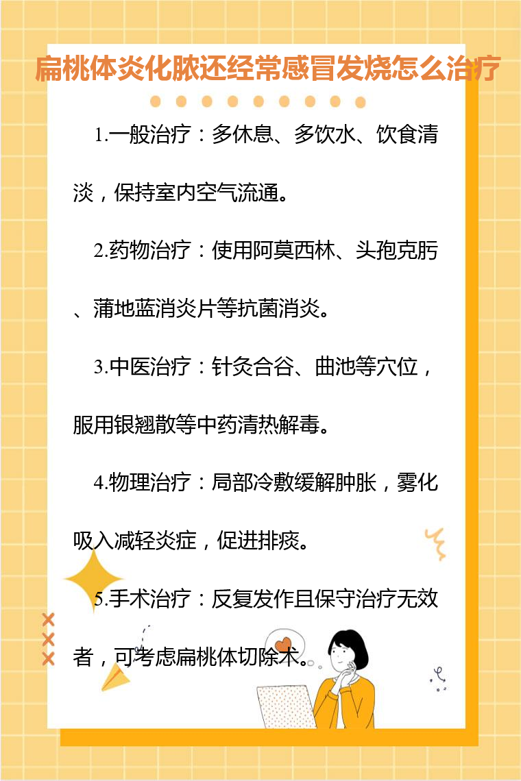 扁桃体炎化脓还经常感冒发烧可通过一般治疗、药物治疗、中医治疗、物理治疗、手术治疗等方法来应对。