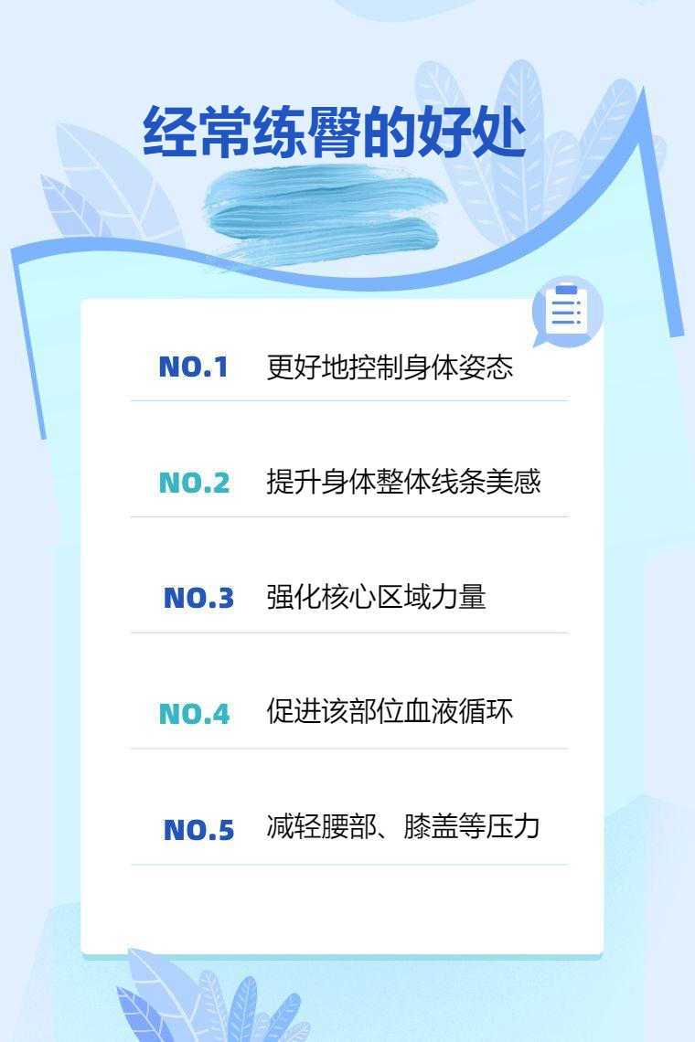 5. 预防疾病:强化臀部肌肉可减轻腰部、膝盖等部位压力,降低因长期不良姿势或过度劳累引发的腰部疼痛、膝关节疾病风险,还能提高身体代谢水平,对预防心血管疾病、糖尿病等慢性疾病有一定帮助。