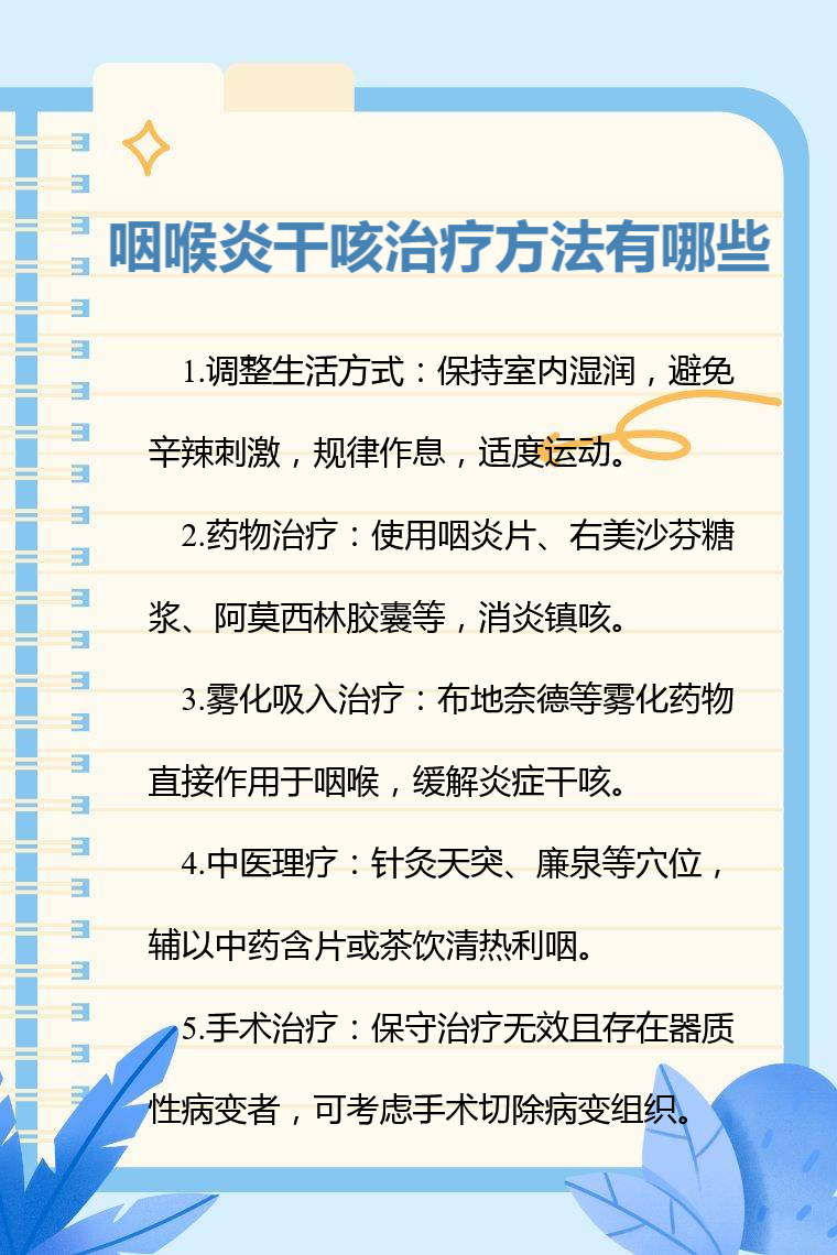 咽喉炎干咳的治疗方法有调整生活方式、药物治疗、雾化吸入治疗、中医理疗、手术治疗等。