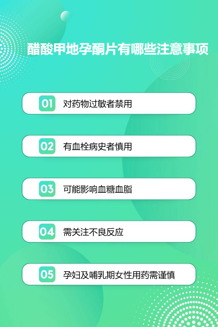 醋酸甲地孕酮片的注意事项包括对药物过敏者禁用、有血栓病史者慎用、可能影响血糖血脂、需关注不良反应、孕妇及哺乳期女性用药需谨慎等。