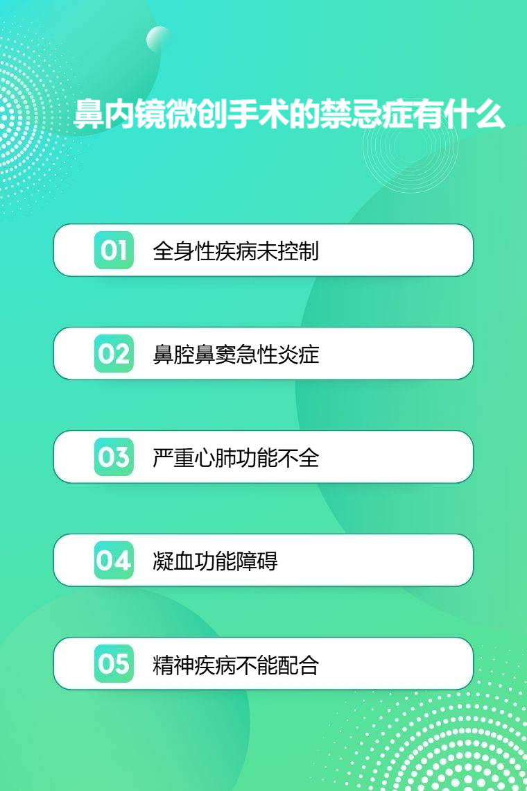 鼻内镜微创手术的禁忌症有全身性疾病未控制、鼻腔鼻窦急性炎症、严重心肺功能不全、凝血功能障碍、精神疾病不能配合等。常见的用于相关治疗的含剂型药品有阿莫西林胶囊、布地奈德鼻喷雾剂、桉柠蒎肠溶软胶囊、鼻渊通窍颗粒、藿胆丸等,使用这些药物务必严格遵医嘱。