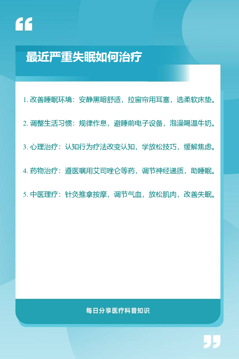 1. 改善睡眠环境:营造安静、舒适、黑暗且温度适宜的睡眠环境对严重失眠有帮助。安静的环境可减少外界干扰,使人更容易放松身心进入睡眠状态;舒适的床铺和合适的温度能提升身体的舒适度,降低身体的不适感,从而利于入睡。可拉上窗帘遮挡光线,使用耳塞减少噪音,选择柔软舒适的床垫和被子。