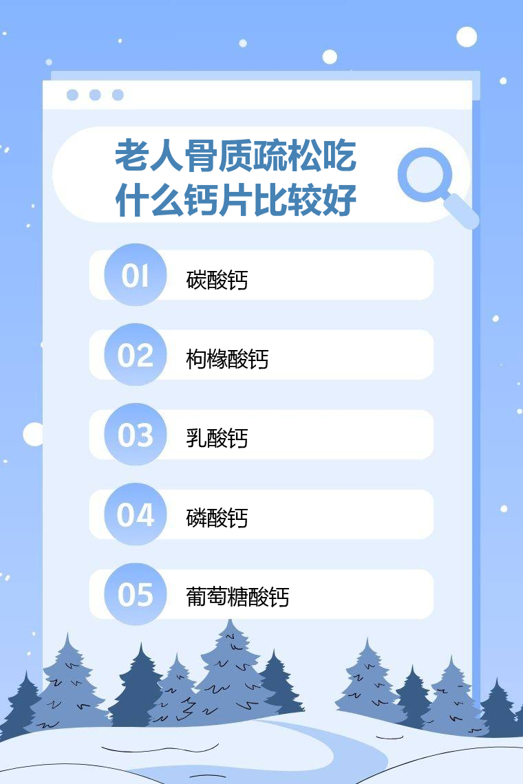 老人骨质疏松一般吃碳酸钙、枸橼酸钙、乳酸钙、磷酸钙、葡萄糖酸钙等钙片比较好。