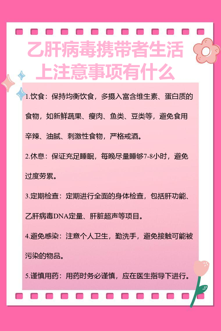 5.谨慎用药:用药时务必谨慎,很多药物都需经过肝脏代谢,不当用药可能增加肝脏负担甚至造成肝损伤。如需用药,应在医生指导下进行,告知医生自身乙肝病毒携带者身份,以便选择对肝脏影响小的药物。