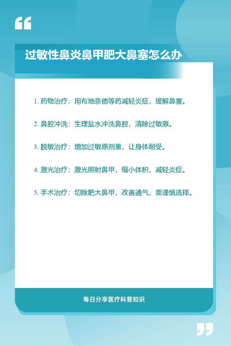 过敏性鼻炎鼻甲肥大鼻塞可通过药物治疗、鼻腔冲洗、脱敏治疗、激光治疗、手术治疗等方法来缓解。
