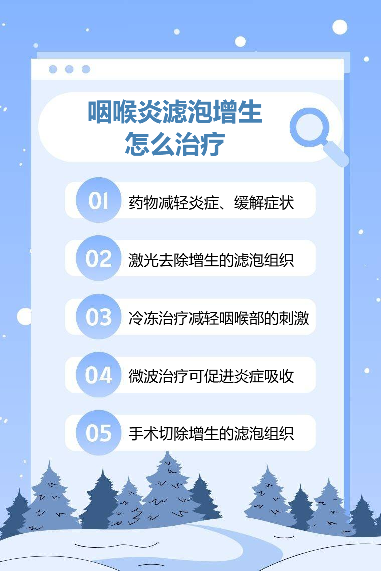 咽喉炎滤泡增生的治疗方法有药物治疗、激光治疗、冷冻治疗、微波治疗、手术治疗等。
