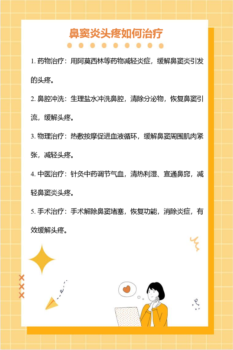 鼻窦炎头疼可通过药物治疗、鼻腔冲洗、物理治疗、中医治疗、手术治疗等方法缓解。