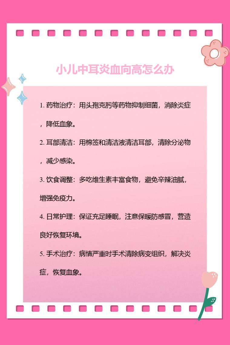 小儿中耳炎血象高可通过药物治疗、耳部清洁、饮食调整、日常护理、手术治疗等方法应对。