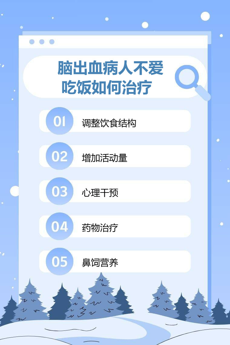 脑出血病人不爱吃饭可通过调整饮食结构、增加活动量、心理干预、药物治疗、鼻饲营养等方法治疗。
