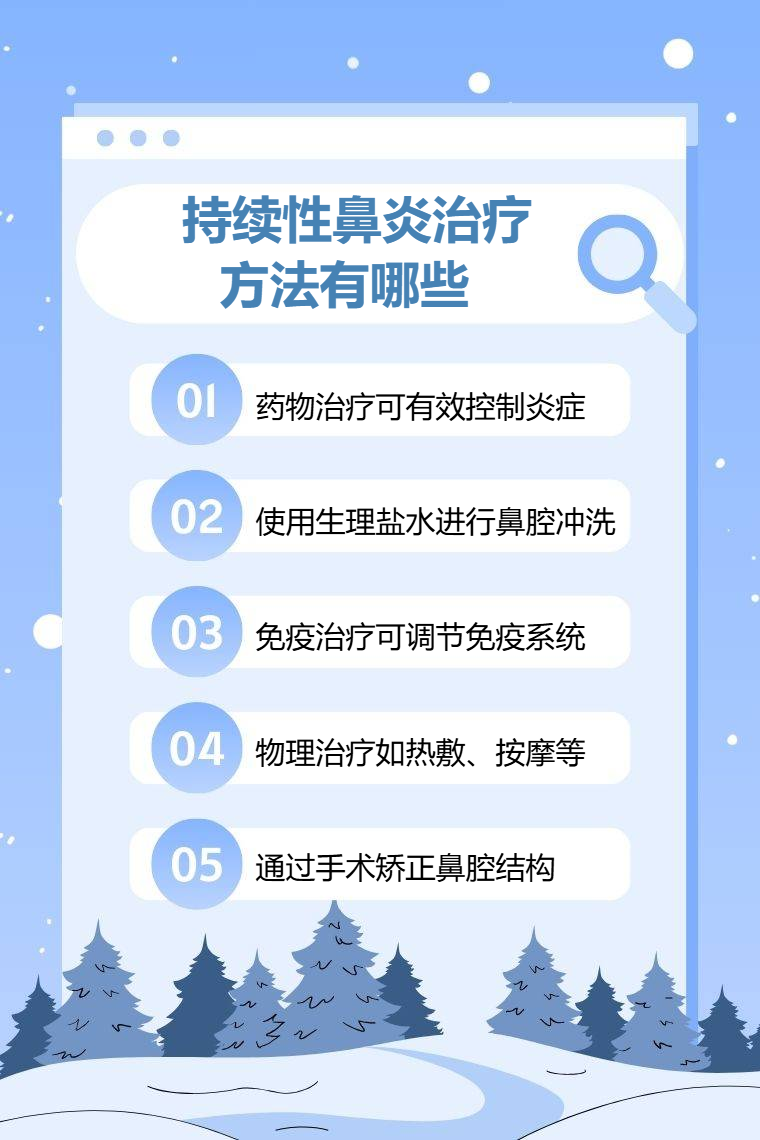 持续性鼻炎的治疗方法有药物治疗、鼻腔冲洗、免疫治疗、物理治疗、手术治疗等。