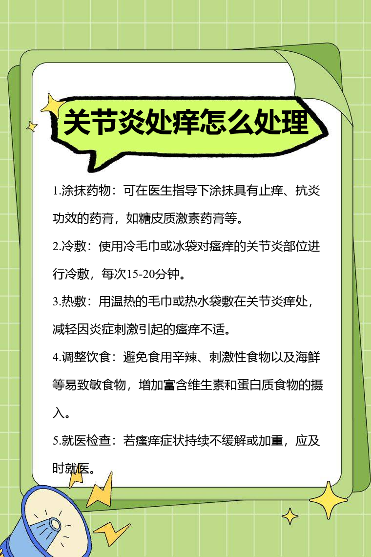 关节炎处痒可通过涂抹药物、冷敷、热敷、调整饮食、就医检查等处理。