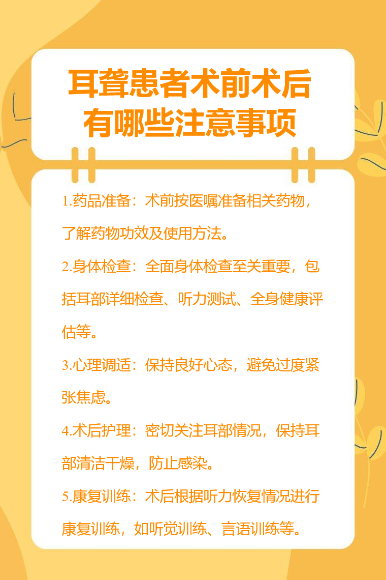耳聋患者术前术后注意事项涵盖药品准备、身体检查、心理调适、术后护理、康复训练等。