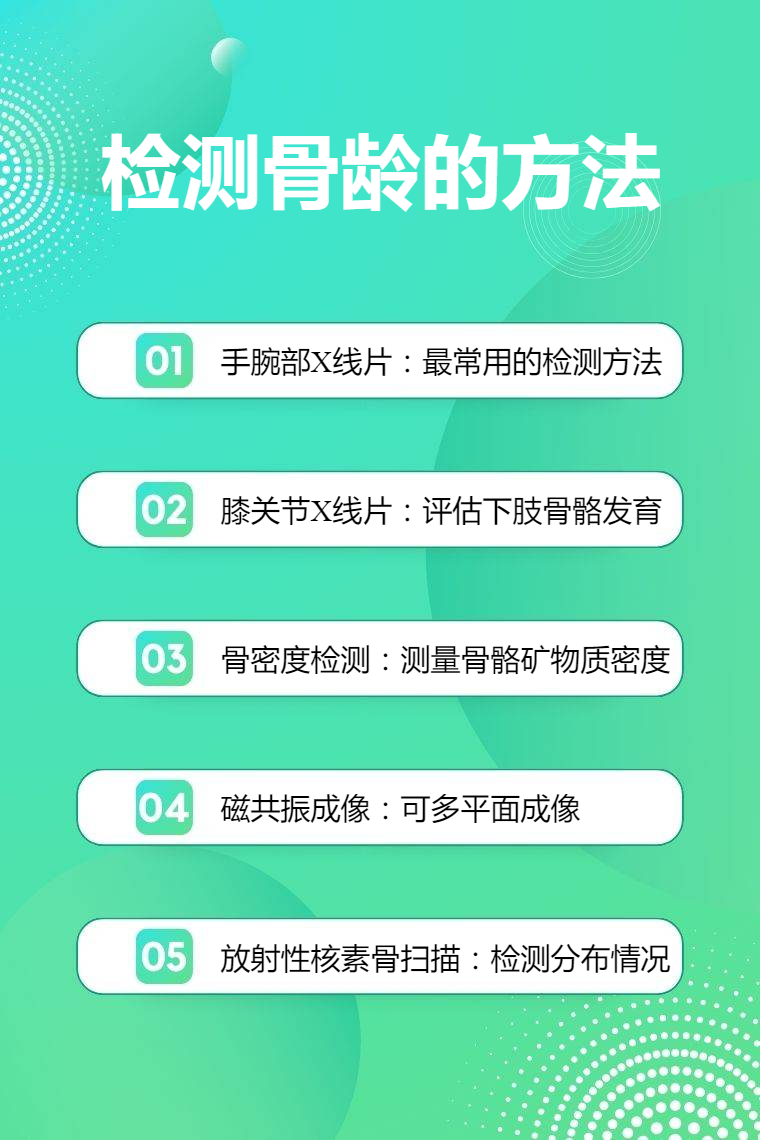 检测骨龄的方法有手腕部X线片、膝关节X线片、骨密度检测、磁共振成像、放射性核素骨扫描等。