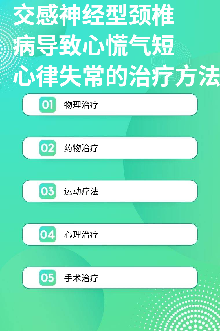 交感神经型颈椎病导致心慌气短心律失常的治疗方法有物理治疗、药物治疗、运动疗法、心理治疗、手术治疗等。