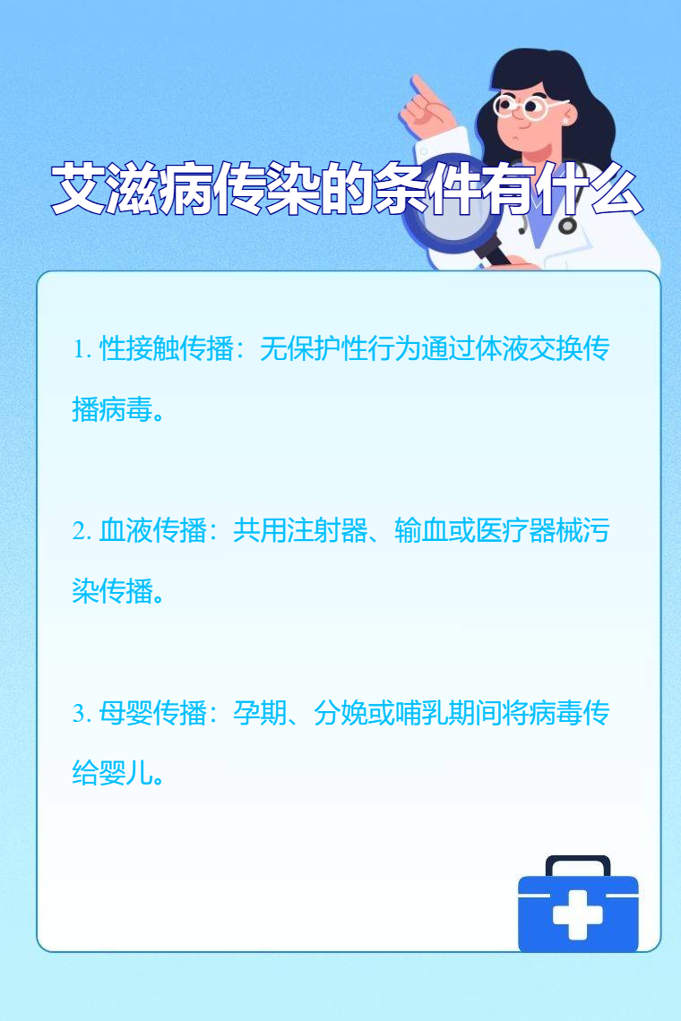 艾滋病传染的条件有性接触传播、血液传播、母婴传播等。