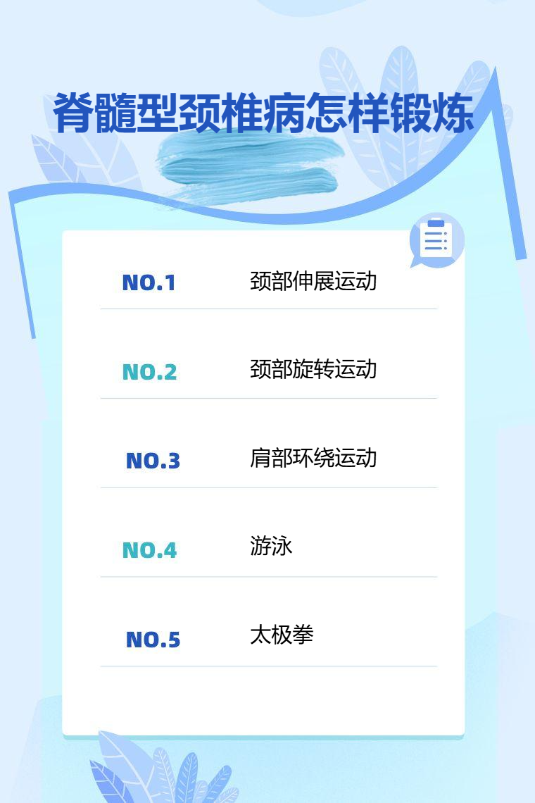 脊髓型颈椎病的锻炼方式有颈部伸展运动、颈部旋转运动、肩部环绕运动、游泳、太极拳等。