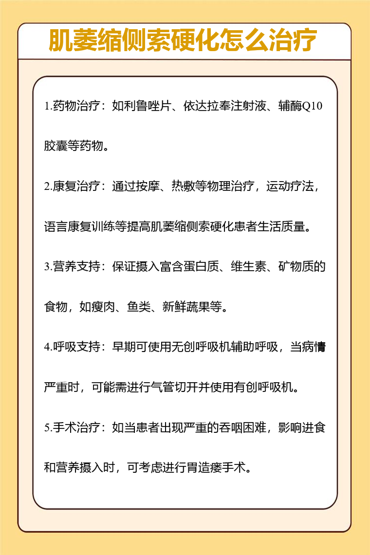 肌萎缩侧索硬化的治疗方法包括药物治疗、康复治疗、营养支持、呼吸支持、手术治疗等。