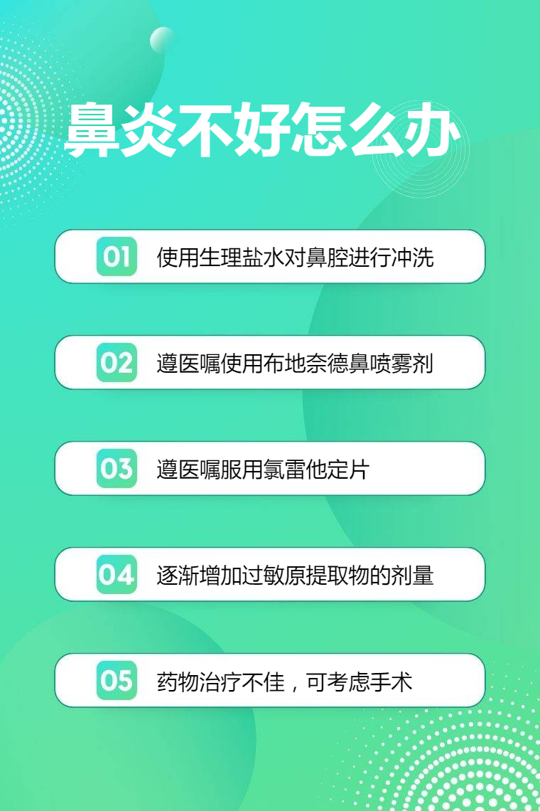 鼻炎不好可尝试鼻腔冲洗、使用鼻喷药物、口服药物、脱敏治疗、手术治疗等。