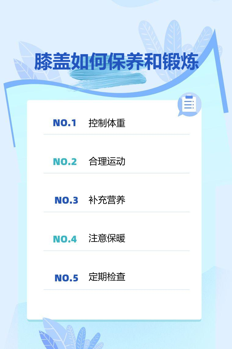 2. 合理运动:选择适合的运动方式对膝盖保养至关重要。如散步、游泳等低强度运动,可增强腿部肌肉力量,提高关节稳定性。避免长时间蹲跪、爬山等对膝盖冲击力大的运动。运动前充分热身,运动后做好拉伸,减少运动损伤。
