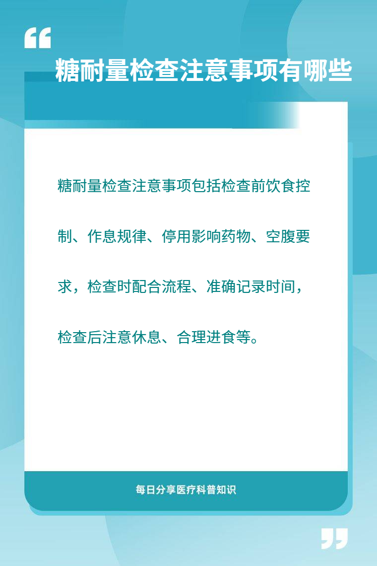糖耐量检查注意事项包括检查前饮食控制、作息规律、停用影响药物、空腹要求,检查时配合流程、准确记录时间,检查后注意休息、合理进食等。
