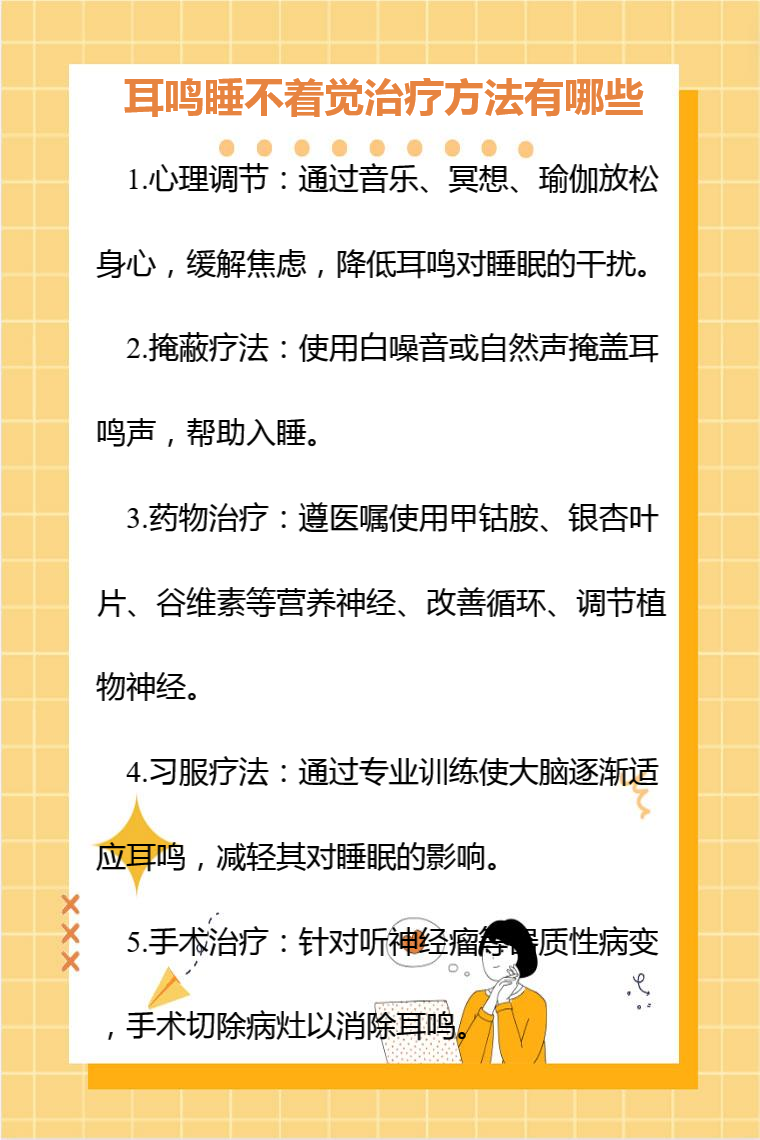 耳鸣睡不着觉的治疗方法有心理调节、掩蔽疗法、药物治疗、习服疗法、手术治疗等。