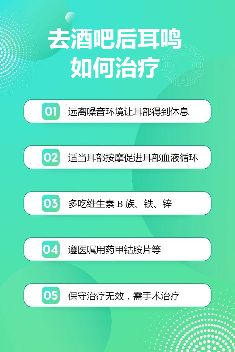去酒吧后耳鸣可通过远离噪音环境、耳部按摩、调整饮食、药物治疗、手术治疗等方法来缓解和治疗。