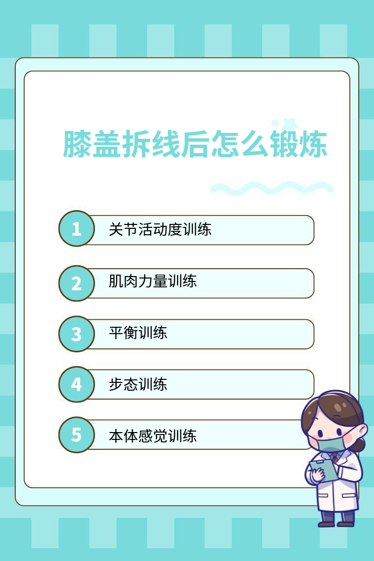 膝盖拆线后可通过关节活动度训练、肌肉力量训练、平衡训练、步态训练、本体感觉训练等进行锻炼。