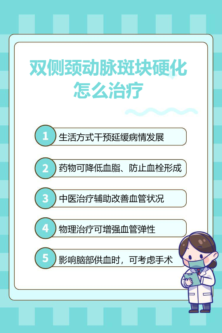 5. 手术治疗:当双侧颈动脉斑块硬化严重,导致血管狭窄超过一定程度,影响脑部供血时,可考虑手术治疗。如颈动脉内膜切除术,直接切除增厚的内膜和斑块,恢复血管内径,改善血流;颈动脉支架植入术,通过植入支架撑开狭窄血管,保持血管通畅,降低脑缺血风险。