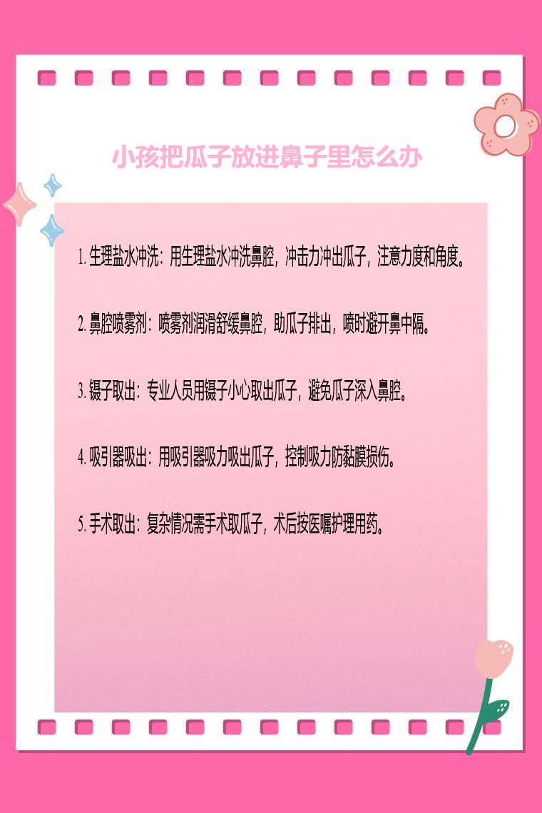 当小孩把瓜子放进鼻子里时,常见处理方式有生理盐水冲洗、鼻腔喷雾剂、镊子取出、吸引器吸出、手术取出等。但无论使用何种方式,都务必严格遵医嘱用药使用药物。
