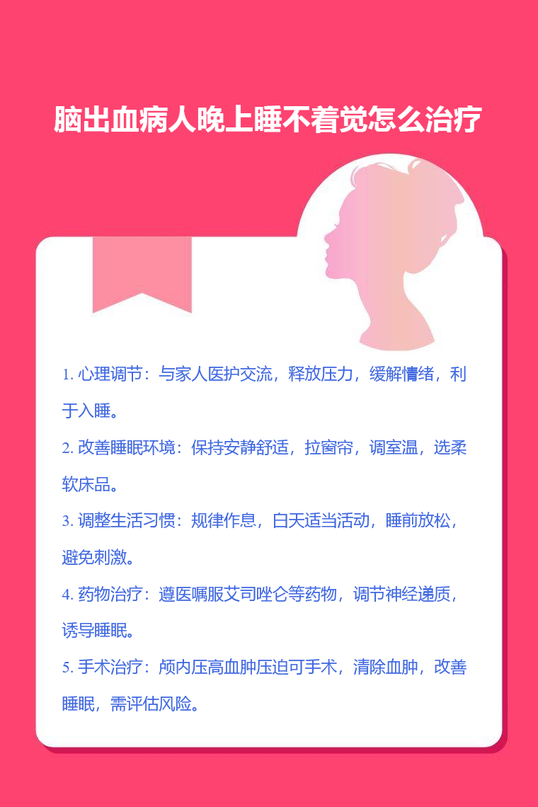 脑出血病人晚上睡不着觉可通过心理调节、改善睡眠环境、调整生活习惯、药物治疗、手术治疗等方法来缓解。