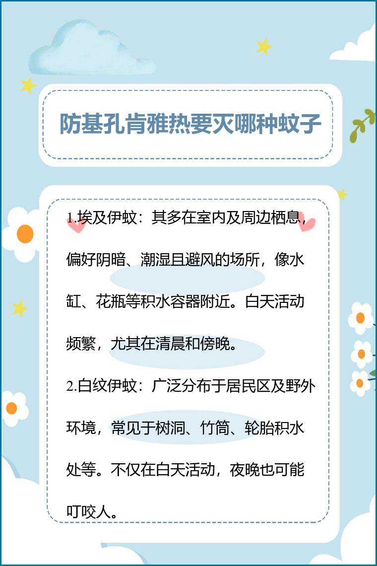 防基孔肯雅热要灭埃及伊蚊、白纹伊蚊等。