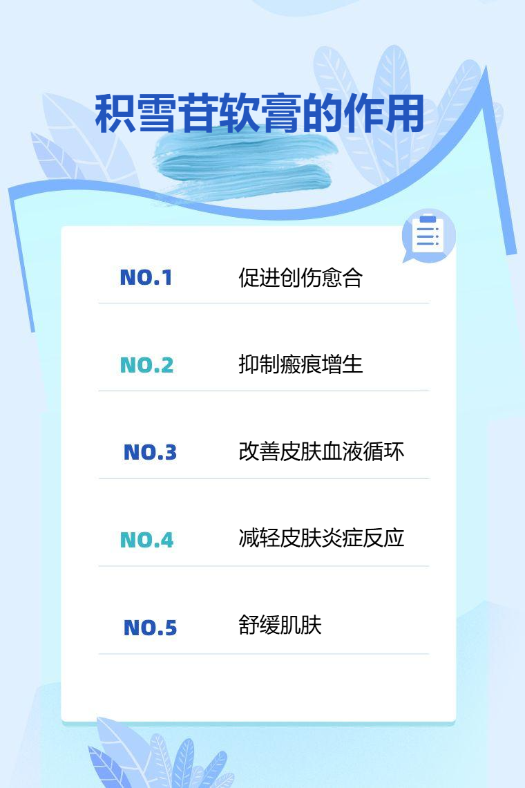 积雪苷软膏具有促进创伤愈合、抑制瘢痕增生、改善皮肤血液循环、抗炎、舒缓肌肤等作用。