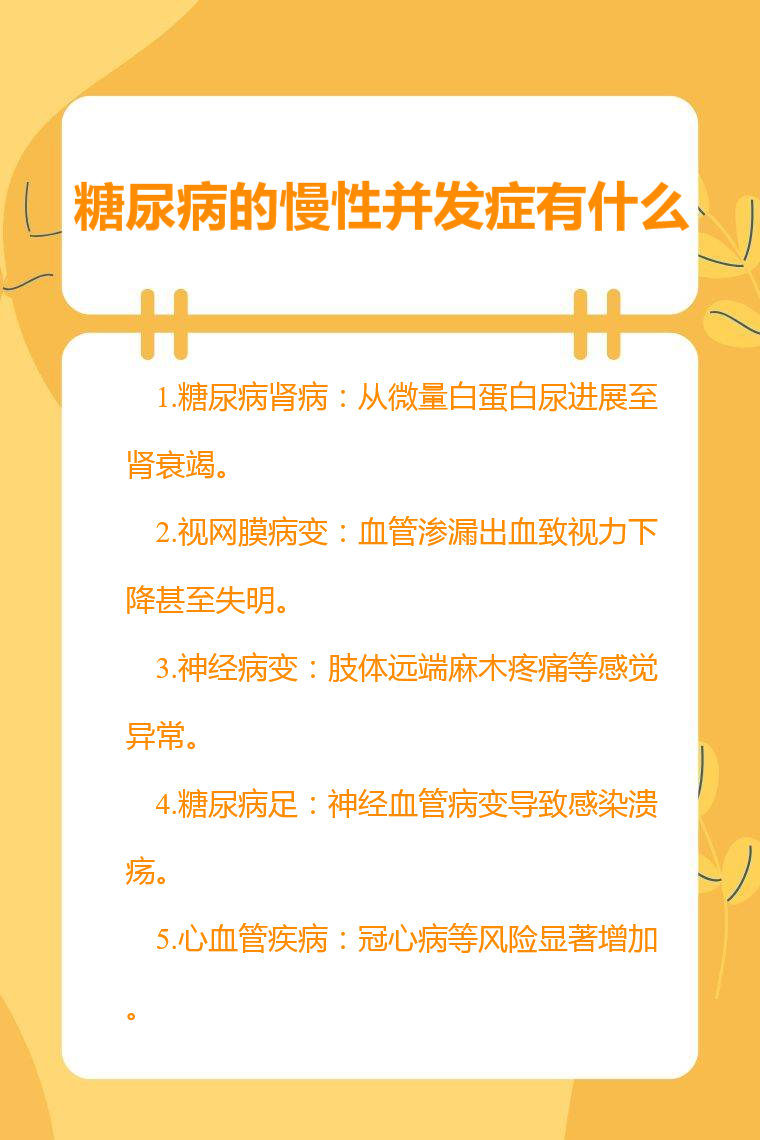 1. 糖尿病肾病:是糖尿病常见的微血管并发症之一,早期可出现微量白蛋白尿,随着病情进展,可发展为大量蛋白尿、肾功能不全,最终可能导致肾衰竭,严重影响患者的生活质量和生存期。