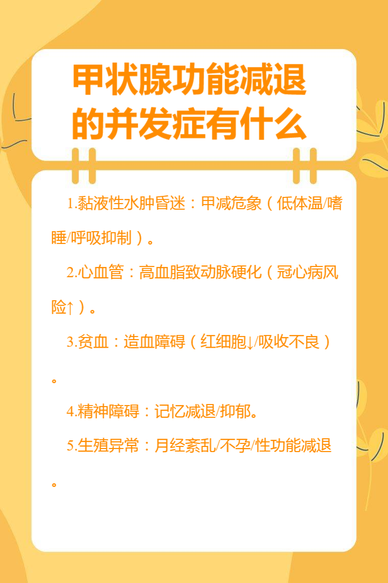 4. 精神障碍:甲状腺功能减退患者可能出现记忆力减退、反应迟钝、抑郁等精神症状,严重影响生活质量和社交功能。