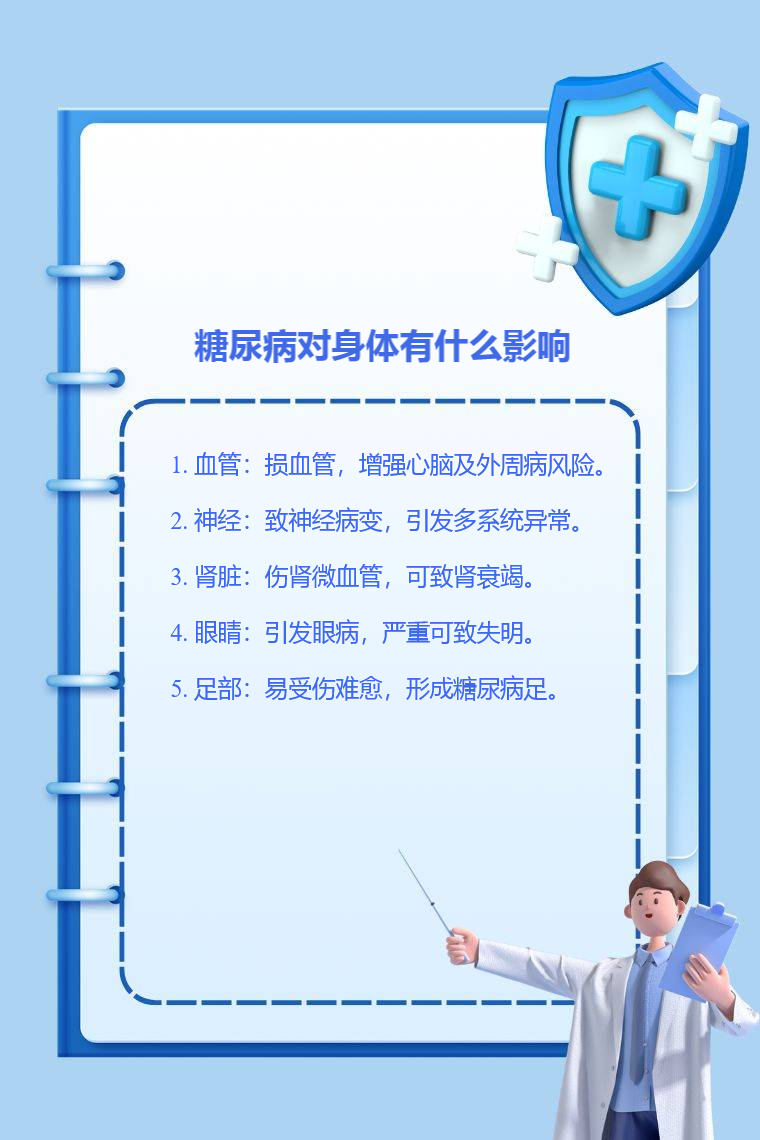 糖尿病对身体的影响涉及血管、神经、肾脏、眼睛、足部等。