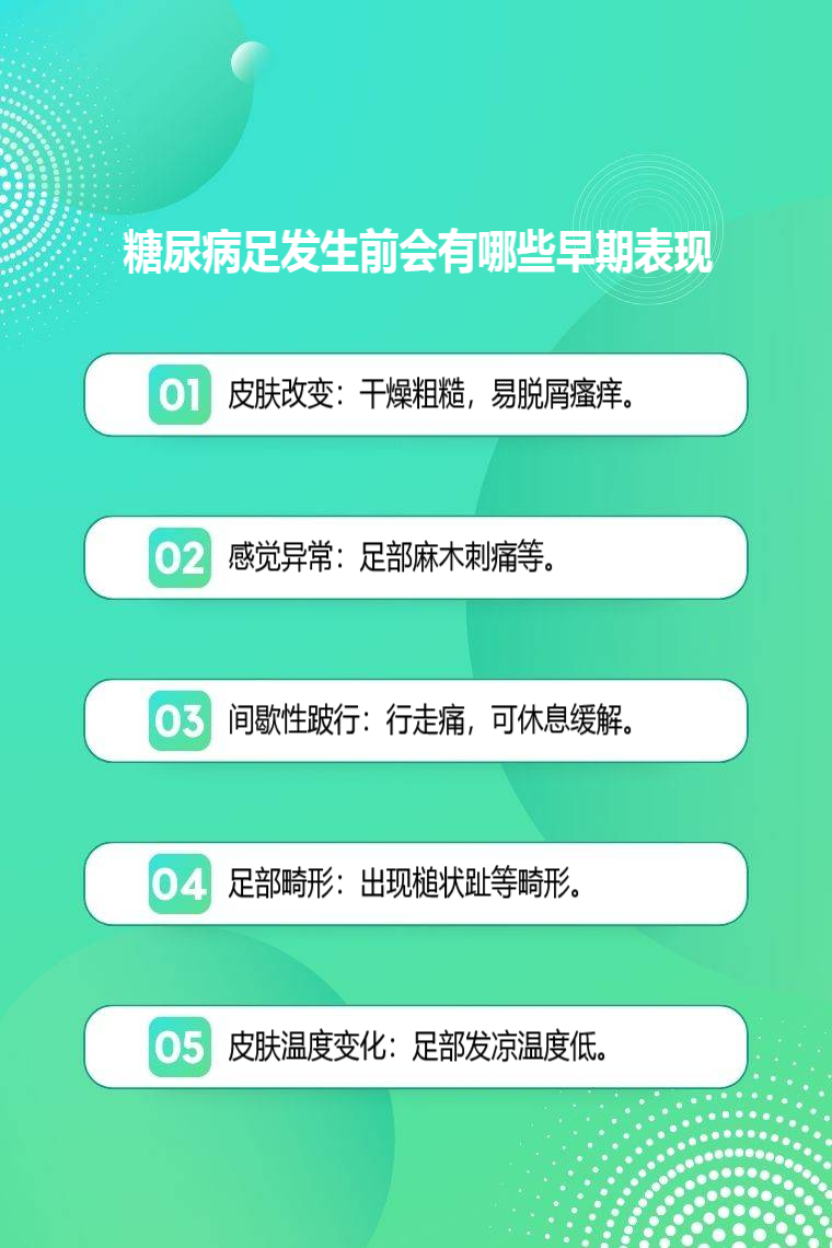 糖尿病足发生前的早期表现有皮肤改变、感觉异常、间歇性跛行、足部畸形、皮肤温度变化等。
