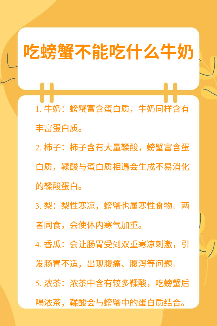 1. 牛奶:螃蟹富含蛋白质,牛奶同样含有丰富蛋白质。二者一起食用,会增加肠胃消化负担,可能引发消化不良、腹胀、腹痛等不适症状。而且螃蟹中的某些成分与牛奶中的成分相互作用,可能影响营养吸收。