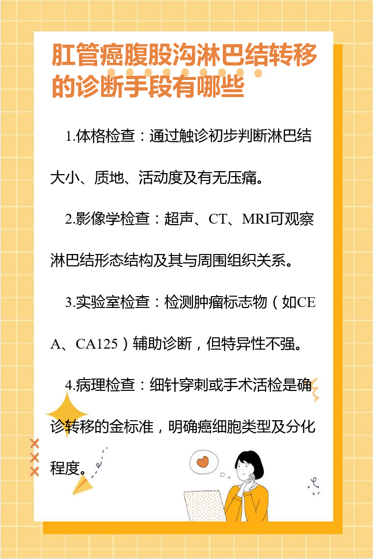 肛管癌腹股沟淋巴结转移的诊断手段有体格检查、影像学检查、实验室检查、病理检查等。