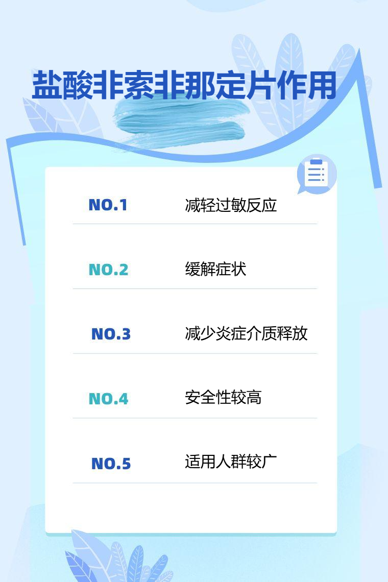 1. 抗过敏:盐酸非索非那定片是一种第二代抗组胺药物,能有效阻断组胺与受体的结合,从而减轻过敏反应。通过抑制组胺的作用,可缓解因过敏引发的多种不适。